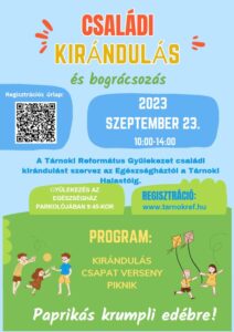 2023.09.23-án szombatunk várunk minden református tárnoki családot egy közös kirándulásra és bográcsozásra. A Tárnoki Egészségháztól közösen elsétálnánk a halastóig, majd ott egy piknikkel egybekötött ebédet tartanánk.